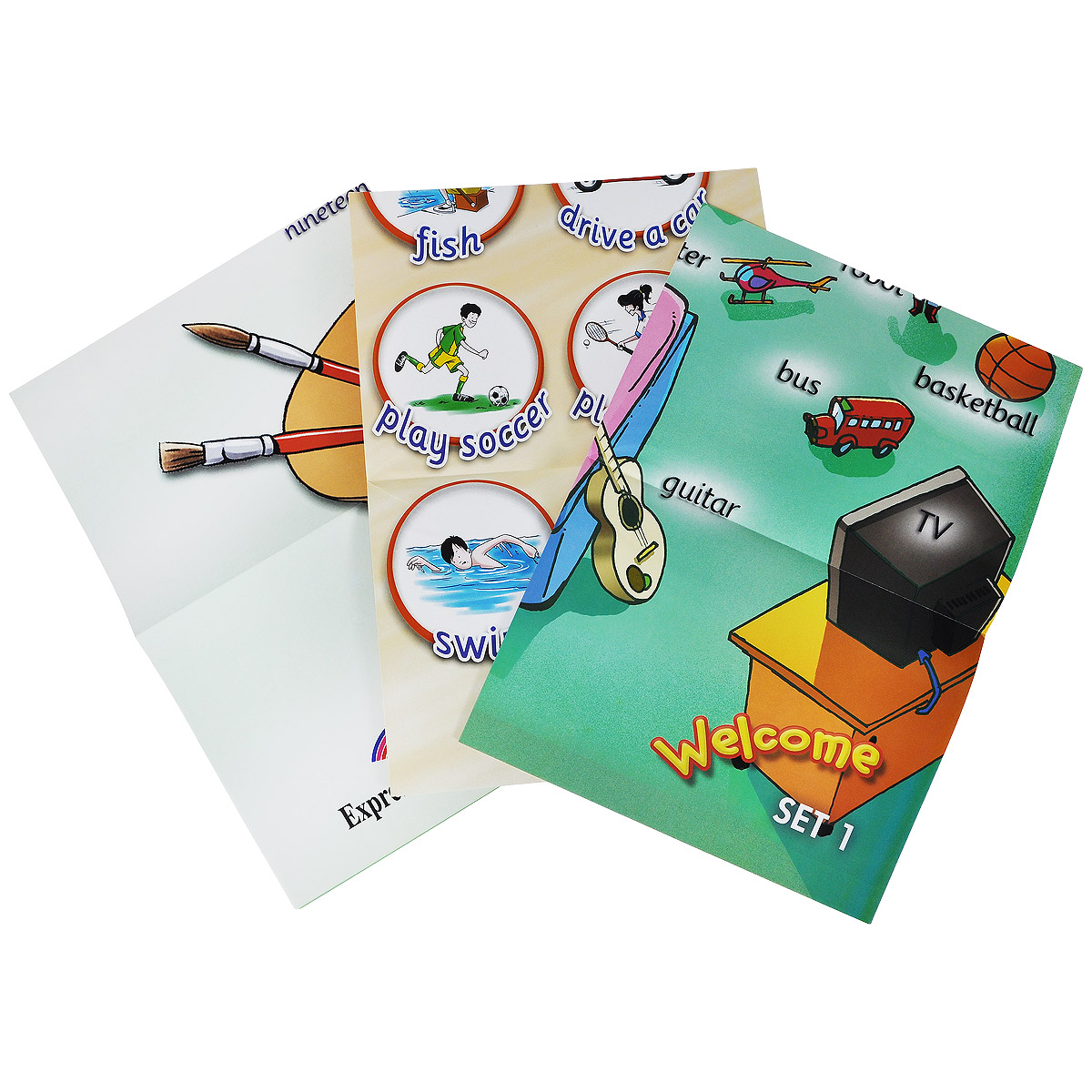 Постеры запечатаны с двух сторон и включают слова по следующим темам: "My room", "Jobs and Clothes", "Actions", "My body", "Numbers and colours", "My house".