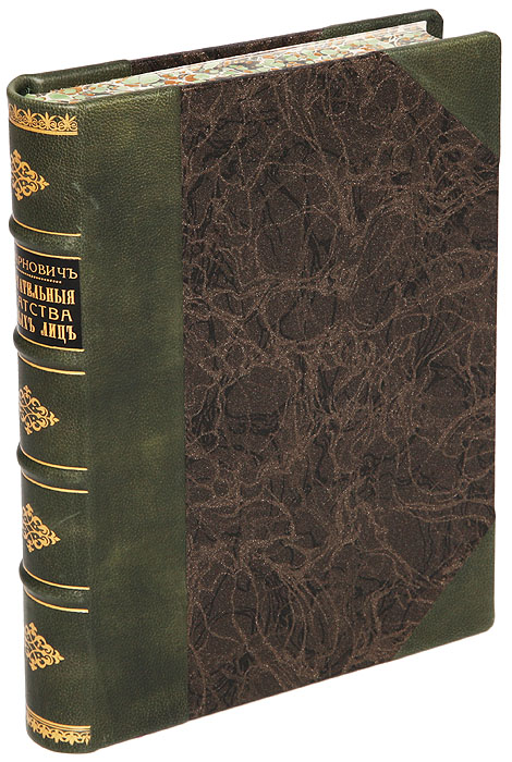 Профессиональный новодельный переплет. Кожаный бинтовой корешок с золотым тиснением, кожаные уголки. Узорный обрез.